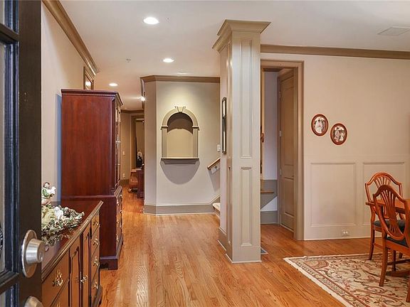Desirable Academy Park, walk to Alpharetta City Center! Sought after Master on the Main, Custom Closets & private access to the spacious Deck. Welcoming covered Front Porch w leaded door entrance opens to 2 story Foyer, hardwoods throughout & Banquet sized Dining Rm. Great Room overlooks Spacious Kitchen w large island, granite, SS, breakfast bar and separate eat in kitchen. Access the Large private deck w views of wooded backyard. Upper level includes two secondary Guest Suites w private Baths,finished Media Room & loft/office.Unfinished basement, stubbed/sep HVAC.