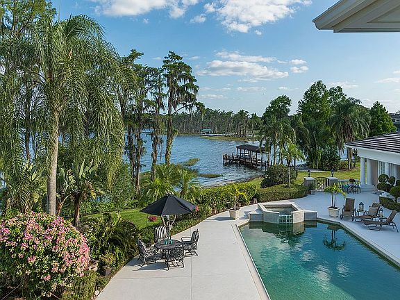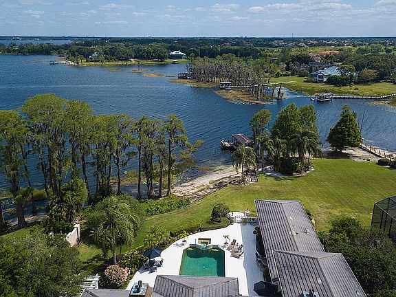 Experience Butler Chain living at its finest in this stunning Akers custom home, situated on a quiet cove of Lake Butler, within the gated community of Chaine du Lac! This home is filled with recent updates, such as a newly resurfaced pool, fresh paint throughout, refinished wood floors, and so much more! The stately curb appeal of this 6 bedroom, 6/2 bathroom, 8,887 sqft home sets high expectations as you make your way past the 4-car garage and courtyard-like driveway up to the custom wood doors with gorgeous glass inlays. Upon entering the home, you are sure to be impressed by the awe-inspiring 22' ceilings and picturesque views of the extensive pool area and shimmering lake. Ideal for entertaining, the formal living room features a grand gas fireplace, floor to ceiling windows, coffered ceiling, French doors leading to the covered lanai, and a spiral staircase leading to the 2nd floor billiard room. Open to the living room is the formal dining room framed by gorgeous columns and handmade plaster crown molding. A complete Butler's pantry connects the dining room to the renovated chef's kitchen, which boasts wood faced appliances, metal tile backsplash, granite counters, solid wood Busby cabinets, double wall ovens and a large center island with Dacor cooktop and crystal chandelier. Off of the kitchen is the dinette with a built-in work desk, a staircase leading to the second floor bedrooms, and the family room with wood paneled ceiling and an abundance of natural light through French doors leading to the pool patio. As expected within a true split floor plan, the first-floor master's retreat is located across the home through double doors just off the formal living room. The spacious master provides a quiet place to escape with a separate sitting room, a wet bar with a mini fridge, a massive walk-in closet with custom shelving, and a spa-like master bath with Egyptian tile flooring, whirlpool tub, separate walk-in shower, and custom dual sink vanity that provides plenty of storage space. From the master, French doors lead out to the oversized patio with a sparkling swimming pool, full summer kitchen with bar, covered outdoor dining room, and a grand stone stair case down to the rolling lawn that leads to your very own covered dock and boat lift. Staying true to the luxury lifestyle, the home offers a separate guest cottage, a home theater above the garage, and built-in floor safe within an oversized cedar-lined walk-in storage closet. Additional features include an executive office with custom Busby built-in cabinetry and beautiful wood ceiling detail, multiple walk-out balconies, second floor billiards room with stone wood-burning fireplace, custom built bar, and half bath; gas generator that powers the guest cottage, kitchen, and summer kitchen refrigerators; Icynene spray foam insulation with radiant barrier, and lightning rod protection system, to name a few... Conveniently located with easy access to the FL-429 for a quick drive to Downtown Orlando, both IOA and the Orlando Executive airport, and just minutes from Winter Garden Village, top attractions, and top-rated schools - this home encompasses the Windermere lakefront lifestyle!