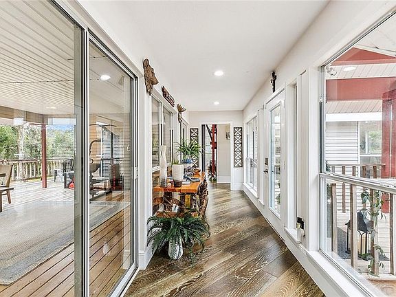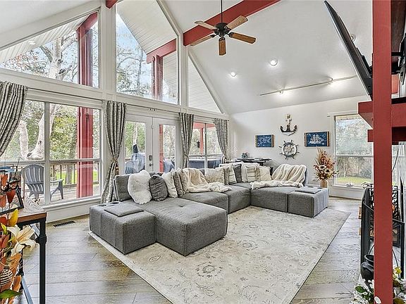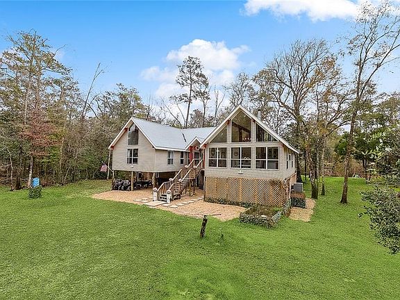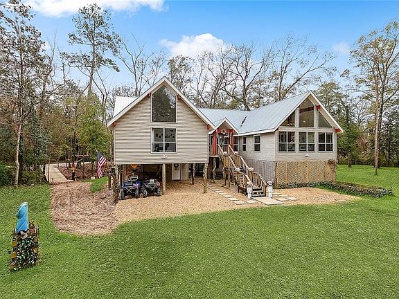 Outdoor paradise with stunning architect-designed home! This one of a kind home features vaulted ceilings throughout and walls of windows to bring the beauty of the outdoors in. Brand new kitchen features white cabinets and Quartz counters with wine storage and wine fridge, overlooking the generous sized dining room. The spacious living room has a wood-burning fireplace, vaulted ceilings and access to the large deck that runs along the back of the home. New French Oak wood flooring was recently installed throughout the home along with 2 new bathrooms. 2 en suite bedrooms and large laundry room round out the main level with a 3rd bedroom/bonus room upstairs. There is also a ground level storage room and additional storage area under the house. The 3+ acre lot includes a sand volleyball court, zipline, firepit and grill, and a sand beach on the river plus cleared and wooded areas. This home must been seen to appreciate all it has to offer.