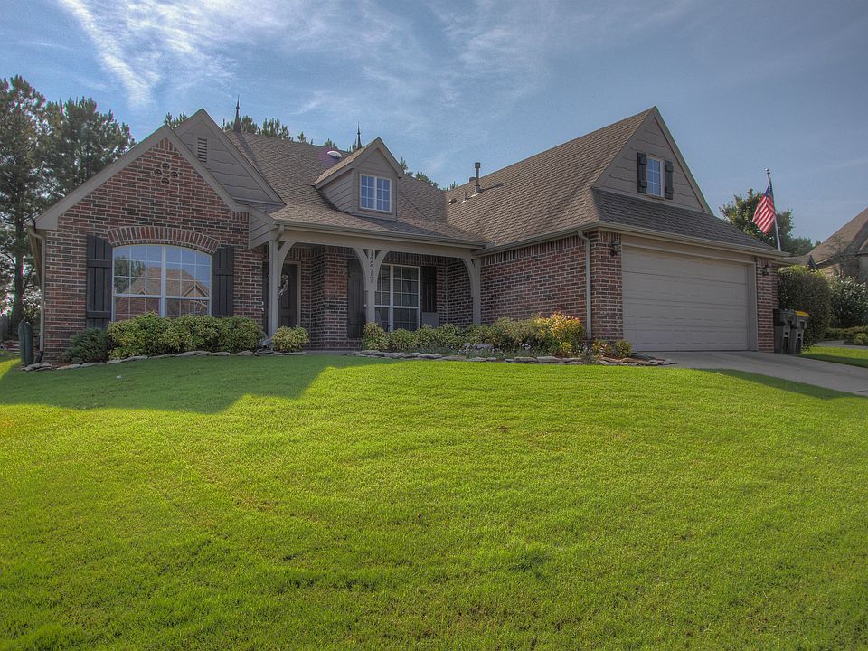 Red brick beauty on a cul-de-sac backs to Five Oaks Lodge in Jenks. Custom cabinets w/ soft-close drawers throughout. Kitchen w/ gas stove is open to breakfast room and family room w/ fireplace. Lots of windows look out to your professionally landscaped back yard oasis w/ waterfall. Home office or 2nd living & separate formal dining room. High ceilings, 3 split bedrooms, & 2 car garage. Handicap accessible & sprinkler system. Neighborhood pool, park & trails. Bixby schools.