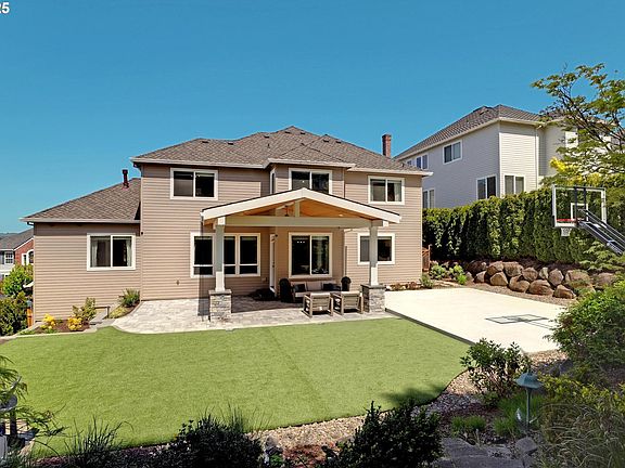 Bauer Oaks - Tasteful updates and an incredible backyard! Nestled on a quiet dead-end street and just a short walk to nearby shops and restaurants, this home blends everyday convenience with standout outdoor living. The fully fenced backyard was professionally renovated in 2024 and designed for year-round enjoyment. Featuring a covered patio with Tongue and Groove ceiling, built-in lighting, a built-in fire pit, a private sports court, and a synthetic turf lawn—perfect for low-maintenance play and entertaining. Whether hosting gatherings or enjoying a quiet evening, this outdoor space is the centerpiece of the home. A separate elevated deck offers a peaceful escape with views of the valley and coastal range. Inside, the main level includes an open-concept great room with a gas fireplace, seamlessly connected to the updated kitchen featuring a Thermador built-in range with downdraft, large island with seating, stainless steel appliances, and a sunny dining nook with direct backyard access. Formal living and dining rooms provide added flexibility for entertaining. The main floor also includes a spacious primary suite with full bath, a dedicated den, and a laundry room. Upstairs, you’ll find three additional bedrooms, a full bathroom, and a large bonus room. An oversized three-car garage offers ample space for storage and hobbies. Top schools: Bonny Slope / Tumwater / Sunset and Close-in Washington County.
