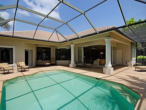 PRIVATE.PEACEFUL.PICTURE PERFECT. Cul-de-sac estate with desirable south-east exposure and expansive lanai with heated pool amidst lush tropical grounds. Long paver driveway leading to columned entry with keystone porch and side-entry 3-bay garage for maximum curb appeal. Indoors, exquisite decor is enhanced by high ceilings with creative treatments and rich crown moldings as well as large picture and mitred glass windows. Wood floors in living, dining rooms and den. Master suite boasting beautiful tray ceiling with cove lighting, His and Her walk-in closets with custom built-ins and bath with large soaking tub and walk-in shower. Casual elegant living at its best with custom wood kitchen featuring granite tops and tumbled marble backsplash, extensive breakfast bar seating, icemaker and island with wine cooler all open to spacious family room with disappearing sliding glass doors to lanai. Custom wood office-work area off kitchen and ample storage closets top it all off. Welcome home to Collier's Reserve! Neighborhood Description Audubon Sanctuary country club with an 18-hole Arthur Hill's designed golf course, tennis courts, fitness center and active sports and social calendar. Canoes available with ramp on the Cocohatchee River. Approx. 1.5 miles to Vanderbilt Beach and Delnor Wiggins State Park by the Gulf of Mexico. Just outside the gates you'll enjoy all the North Naples attractions from Artis-Naples, to the Waterside Shops, to Mercato and the North Collier Regional Park.