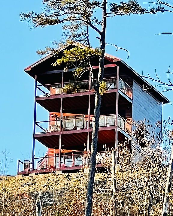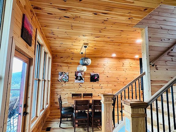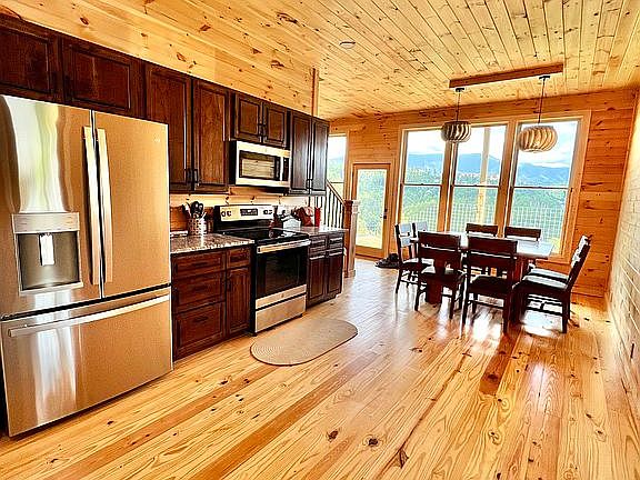 Beautiful custom Mountain cabin with unique touches throughout. Cabin has large kitchen dining area with pantry, 2 master suites with handcrafted tile mosaic showers. Downstairs/rec area with queen bed and full sofa bed, kitchenette with full bath and laundry area. Each of the 3 levels opens onto its own covered porch/deck. Property also has fenced puppy yard. Stunning views from every room.