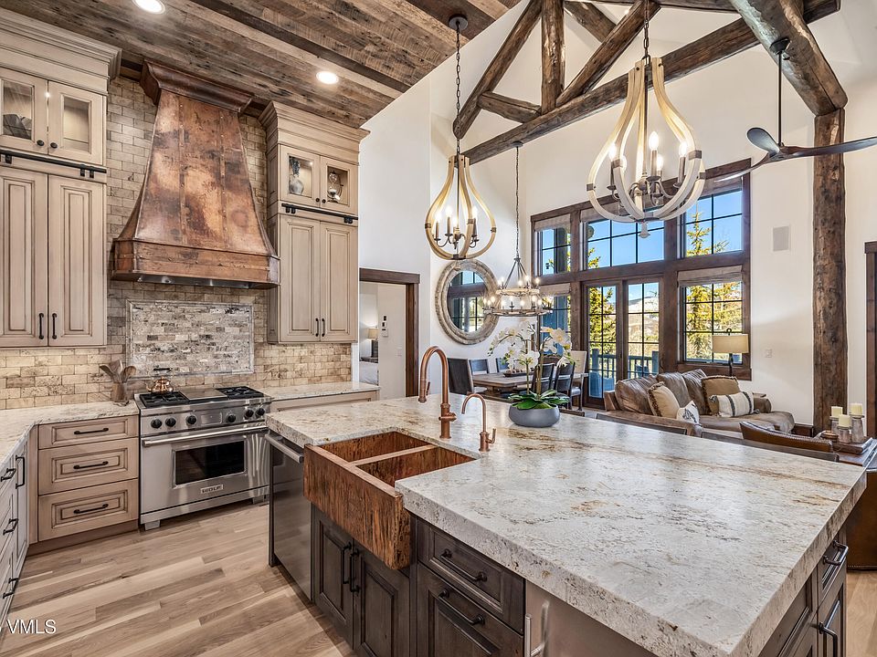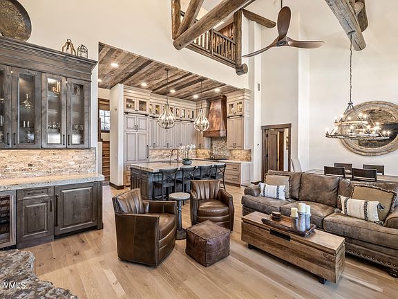 Thoughtfully designed across more than 4,800 square feet, this five-bedroom, seven-bathroom residence welcomes with vaulted ceilings, wooden beams, and expansive windows framing sweeping views of the Gore Range and Game Creek Bowl. The great room's grand stone fireplace anchors the space—an inviting focal point for gathering after days spent on the mountain.