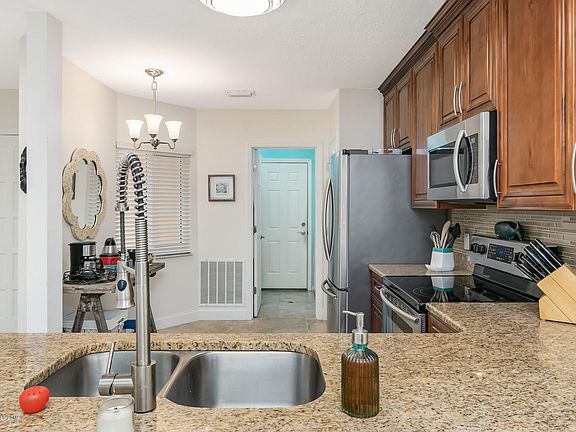Beach lovers dream , access right across the street !!! Beautifully remodelled and upgraded townhouse .New Roof 2019. All living on one level , tumbled travertine floors throughout the home makes life a breeze. Kitchen has granite counter tops, breakfast bar and nook , all appliances are stainless steel . Open plan from kitchen to dinning to living room , light , bright and airy . Living room has cathedral ceilings and a stone wood burning fireplace . All the windows and doors are hurricane rated to 160 mph , no need for shutters. Single car garage with two extra parking spaces what a great bonus . Laundry room is in townhouse and washer and dryer convey . Added attraction , this community has a community pool and clubhouse . So grab your towel, enjoy your Florida lifestyle , right across the street from Paradise Beach .