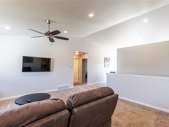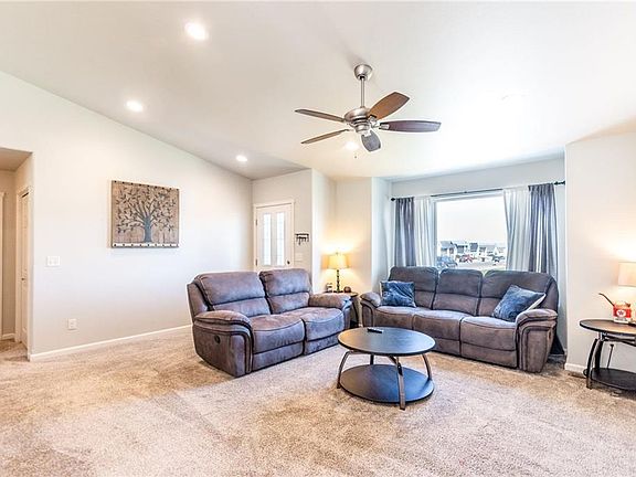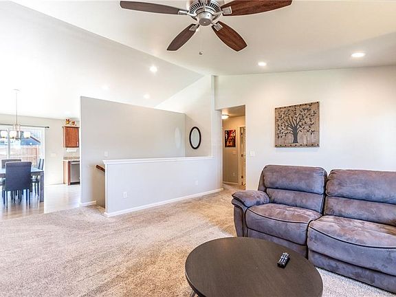 What a bright and airy home! You'll enjoy the vaulted ceiling, recessed lighting, and ceiling fan in the living room. The kitchen is spacious with lots of cabinets and counter space and attractive slate appliances. The dining area offers plenty of room for a large table and has access out to the patio for grilling. The master bedroom has its own ceiling fan, recessed lighting, coved ceiling, huge walk-in closet, and private bath with dual vanity. The two additional main floor bedrooms are located separate from the master, offering more privacy from kids or guests. The basement is mostly finished and offers two more bedrooms, a full bathroom, and a large family room. Additionally this home has main floor laundry, a fenced yard, and a 2 car finished garage with extra parking slab.