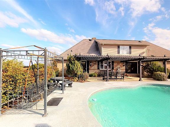 Beautiful home on the hill. This home situated on a hill gazes over a 4.5 acre pasture. Perfect for the equestrian at heart. The master bedroom is beautifully laid out with cathedral ceilings, wood beams, intricate moldings, a large master closet, and bathroom. The family room is a beautiful setting to enjoy family and friends. The family room also has a large stone trimmed fireplace (wood) cased within large built-ins. Located off the family room is a large custom kitchen. It is one of the homes greatest attributes, with expansive mahogany cabinets, large countertops, plentiful lights, and views out into the back patio. The property is 7.4 acres that includes a pool with spa, patio and large pergola for your enjoyment.
