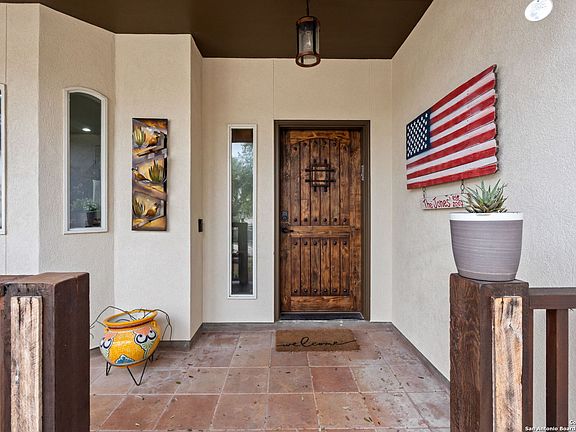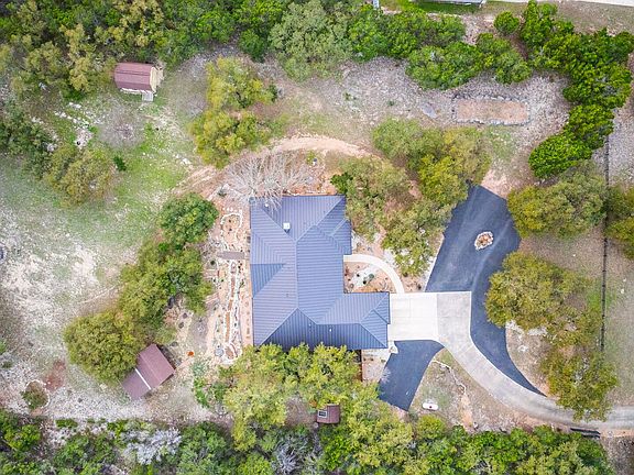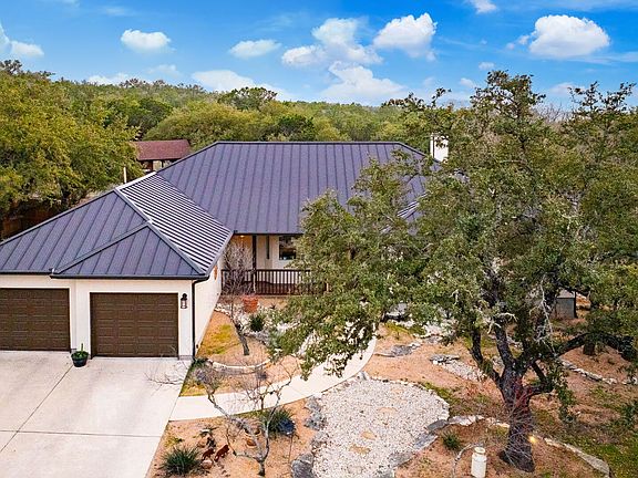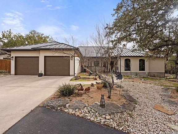 Single-story modern luxury home with Hill Country Charm, only 1.5 miles from Canyon Lake! Open concept floor plan, with stunning panoramic, unobstructed views. Luxury vinyl plank flooring and LED lighting throughout. Great room with a cozy fireplace that provides a perfect place to make memories with friends and family. Chef-inspired, airy kitchen with butcherblock island and Quartz countertops. Premium, professional stainless steel appliances; dual oven gas-powered range with six burners/griddle. Walk-in pantry with ice maker connection. Primary bedroom with views of backyard retreat, additional flex room, perfect for a gym, home office, or sitting area. Natural light fills the en-suite, walk-in shower, dual vanity, extra storage, and walk-in closet. Two additional bedrooms with jack & jill bathroom. Large flex room offers space for the children to play pool and games or watch their favorite movie. Listen to the sound of the tranquil stream as you relax at the end of a long day. Outdoor rustic retreat, with additional storage. Dine al fresco, entertain, or watch your favorite sports team. Two outbuildings provide storage/workshop. A Zen-like space with privacy fence, welcomes calmness as you soak in the hot tub/spa. Extended two-car garage with overhead storage, as well as a temperature controlled room, perfect for an office or a craft room. RV/boat parking with 50/30 amp hook-up!