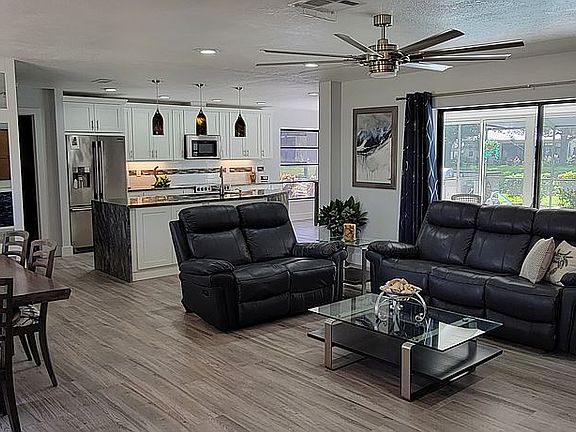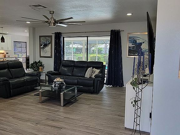 Beautifully remodeled 3 bedroom, 2 bath, lakefront home located in the highly desirable Pinebrook South neighborhood. This home features a spacious open concept floor plan with split bedrooms for privacy. As you enter the front door you will notice the large living room sliding glass doors that provide natural light and access to your private pool and Lanai. Modern plank tile runs throughout the home providing continuity and ease of cleaning. The kitchen features new shaker style cabinets, waterfall granite countertops, stainless steel appliances and LED lighting. With two separate eating areas there is plenty of space to entertain or host family get-togethers. French doors in the master bedroom provide access to your spacious screened in lanai and pool area. The guest suite also has private lanai access. This home also features an outdoor kitchen where you can sear a steak on the large Blaze grill or smoke your favorite meal in the Traeger pellet smoker. The property is graced with mature landscaping and a sprinkler system. The large two car garage features many cabinets for all your storage. Electric shutters on all the windows provide safety from the elements. The roof was replaced in 2020 and a new hot water heater in November 2021.