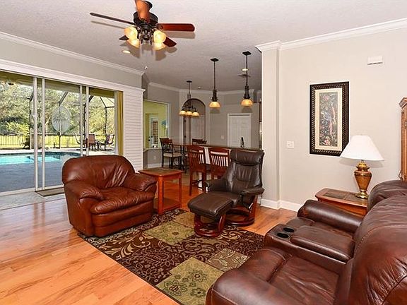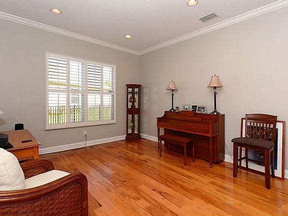Wonderful bright and airy true Florida home. This 4 bedroom, 3 bath home with office is 2,649 sq ft of upgrades! The entrance has a courtyard with iron garden gates leading to the double entry leaded glass doors. High ceilings with triple tray ceilings great for the hotter days when heat rises, helping to keep us cooler! Other upgrades include: golden hardwood floors, 18" decorator tiles, ceiling fans, plantation shutters throughout, breakfast bar, pendant light fixtures, large bright windows, sold surface counters, Jacuzzi tub in master bath with double sinks and large glass shower. The large salt water pool is 8 feet deep with a Solar Heater for extra warmth for winter months. Beautiful built in Jacuzzi with fountain which heats up quickly. Almost all pool equipment is new and under warranty. BBQ area kitchen by the pool surrounded by mature lush landscaping and a fenced in backyard. 3 car garage with a 6x7x8 storage/tool room. Don't miss out on this one, make your appointment today!