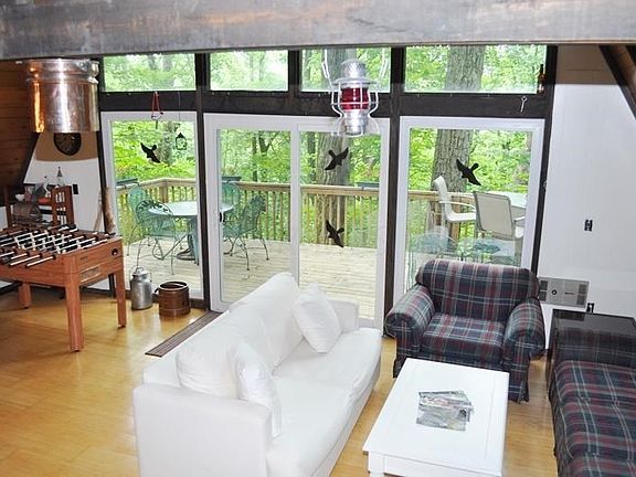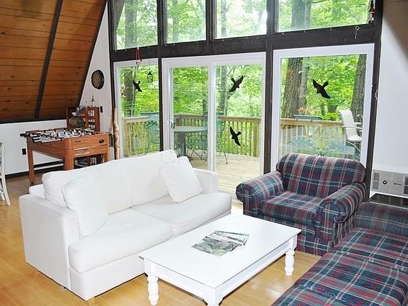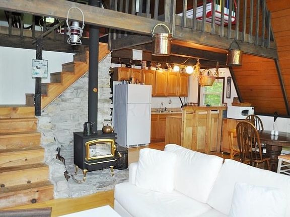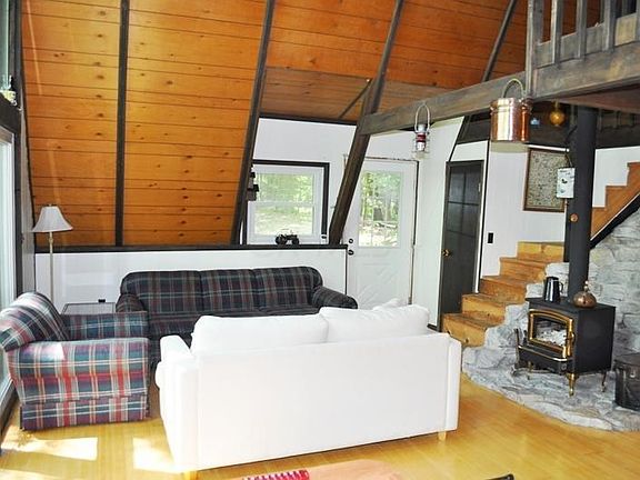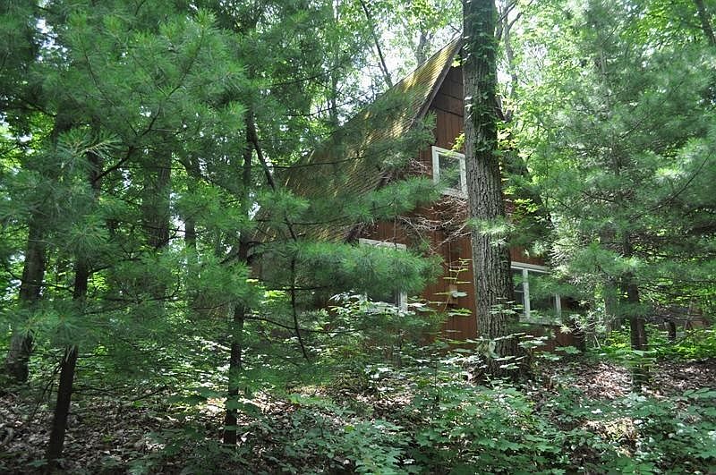 Your own private weekend get-a-way awaits! This quaint cabin style home is situated on 3 lots (totaling 6.1 acres) in Holiday Haven community. The great room offers a living room space with wood burning stove, eating area, and opens to the kitchen. A nice size bedroom and full bath are on the main floor as well. The loft is the 2nd bedroom with space for a sitting/office area and overlooks the great room. A-frame styling with a wall of all windows allows plenty of sunlight and has one of the best views of the sunrise! The view is peaceful whether you're cozy on the couch during the winter months or cooling down with the breeze during the summer. Relax on your back deck and enjoy your coffee or night cap overlooking wooded acreage. Storage Shed. Community lake, beach area, & shelter house.