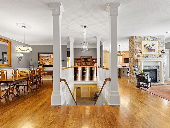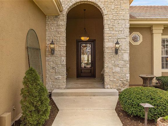 3 BDRM PLUS two additional non-conforming BR's and 1/2 BA downstairs! Step into this stunning Mediterranean-style stucco home w/tile roof, where elegance & functionality blend seamlessly. A covered front porch leads to a custom wrought iron entry door, opening to gorgeous hardwood floors flowing through most of the main living areas. The sun-drenched owner’s suite boasts plush carpet, a cozy sitting area surrounded by windows, a walk-in closet, & a see-through fireplace connecting to the spa-like bathroom featuring custom marble tile, a jetted tub, a shower, & a double vanity. Just beyond the foyer, the sunroom walks out to a charming martini deck & steps leading to the beautifully landscaped backyard. The formal dining room sits at the front, while the kitchen impresses w/silestone counters, a large island featuring an integrated cooktop, a built-in oven, under-cabinet lighting, & a see-through stone fireplace shared by the hearth room. The breakfast area opens to a maintenance-free Trex deck, offering exterior lighting & a dry underdeck ceiling equipped w/a ceiling fan, creating a perfect outdoor retreat. An expansive laundry room includes tile flooring, a built-in sink, & a pantry configured using Elfa shelves. The finished walk-out LL extends the living space, offering a spacious family room w/new decorative carpet, an 18-foot granite wet bar complete w/a sink, shelving, a refrigerator insert, & a DW drawer. A 3rd BR, full bath, 2 additional non-conforming BRs, & a 1/2bath complete the space. The covered patio has a Sunbright TV & is accented by stone walls, vines, & flowers, overlooks a wrought iron-fenced yard backing to a scenic walking trail leading to the community pool & Tomahawk Creek Trail. Built using steel-frame construction, this well-insulated home features 6-inch-thick walls, a sump pump featuring battery backup, & a 3-car garage offering ample storage. Striking architectural details, 2 gas fireplaces, & thoughtful design make this home a rare find.
