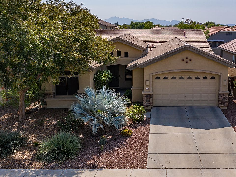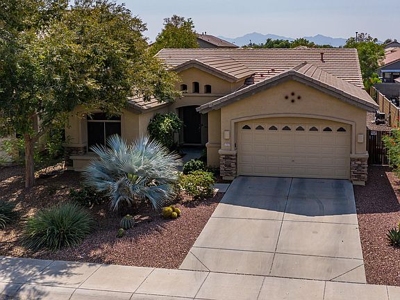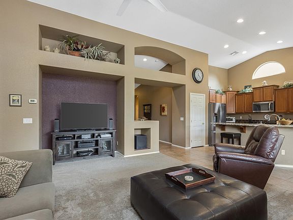You'll love this spacious family home offering 4 bedrooms + den & 2 baths in 2100 SqFt with an open great room floor plan & split bedrooms. The kitchen features 42'' staggered maple cabinetry with crown molding, granite countertops, stainless appliances (including gas cooktop, built-in microwave & wall oven), pantry and large island with breakfast bar seating. French door leads out to the covered patio with ceiling fan, additional paver patio and large backyard complete with grass for kids & pets to play on & mature desert landscaping. The master retreat features its own entrance to the backyard and an attached bath with dual sink vanity, separate tub & shower and walk-in closet. Other features include a 2 car garage with service door, vaulted ceilings, ceiling fans, carpet & tile flooring throughout, stone exterior elevation, laundry room with built-in cabinets & utility sink, newer hot water heater & much more! Schedule your private showing today!