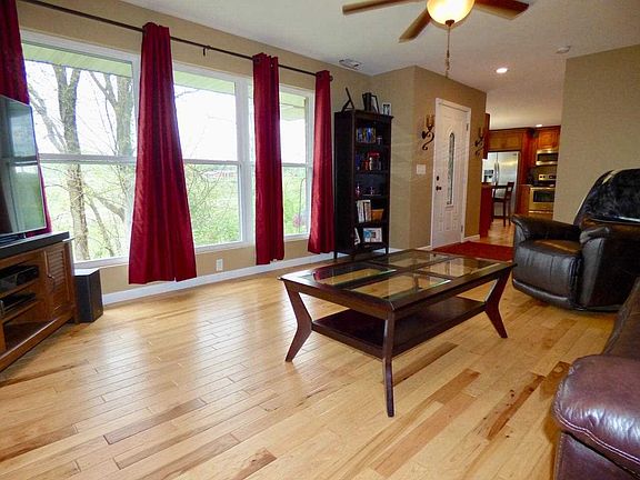 Move into this lovely, private brick ranch that has a wonderful view of Boyd County schools. So close to all the amenities, but yet your own getaway! Located on 12.8 acres m/l, you will have 4-wheel trails and deer roaming for fun and enjoyment. The home features hardwood flooring in the open floor living concept in the kitchen and living area with woodburning fireplace and expansive windows for a lot of natural light to shine through. Kitchen features stainless appliances and stunning wood cabinetry. Living spaces include 3 bedrooms with a master ensuite with beautiful soaking tub and tiled walk-in shower with rain fall shower. Both baths have tile and all bedrooms have carpet. The garage is attached and has steps to lead to additional storage in attic. Everything in this home is 5 years old and under. Including roof and HVAC due to a renovation right before this owner purchased. This is a fabulous home and features 1,800 square feet. Call today!