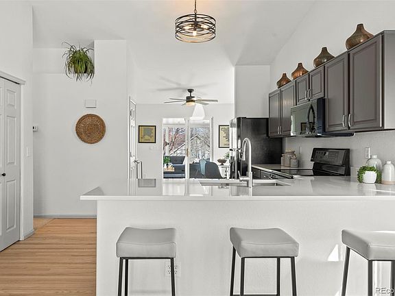 This beautifully remodeled ranch sits on a quiet street in the Eastlake neighborhood, just two blocks from local trails and the N-line light rail that transports directly to Union Station. Every room has been artfully refreshed, even the new, Pella modern front door. The charming front porch is the perfect place to enjoy your garden, morning coffee, and summer nights! Vaulted ceilings and plenty of windows let in lovely natural light and the fireplace is ideal for warming the living room in the early mornings or late evenings. Refinished hardwood floors, updated lighting, freshly painted cabinets equipped with new hardware, and gorgeous Quartz countertops make the kitchen feel open, bright, and new. The sunroom off the kitchen lets in the fresh air and looks out at the mature trees in the yard. Both baths have been updated with new tile, light fixtures, and vanity. The primary bath even has a luxurious shower with multiple shower heads! Spacious primary bedroom with vaulted ceilings, barn door into the bathroom, and walk-in closet. Outside, there is a fully fenced backyard with sweet-smelling trees that provide an oasis and peaceful setting.