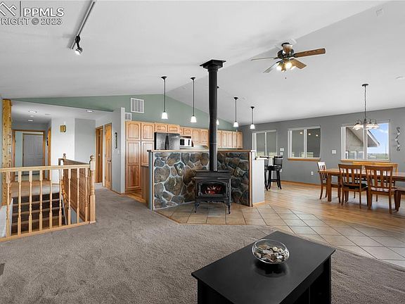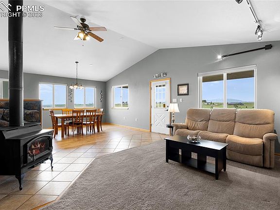 Welcome home to this beautiful rancher on 40 acres with good views of Pikes Peak. This cozy 2004 build offers master bedroom and second bedroom on main floor. A stylish open kitchen and living area are filled with plenty of natural light and a fire place. Stay shaded on the covered composite deck with mountain views. Enjoy the built in Invisi-sound speaker system in great room, master bedroom, and on the porch. Make memories in the walk out basement which offers a large cozy family room , 2 more bedrooms, a 3/4 bath, an office and a sunroom plumbed for a hot tub. A hobbyist/mechanic's dream await's inside the 4,800 SQF Shop featuring 200 AMP service and an additional 100 AMP sub-panel. Heated flooring through out the shop. Shop also features a finished Mother in-law suite with heated, stamped concrete flooring. Get your workout inside the fitness room on second floor of shop. Come see for yourself. This one will not last long!