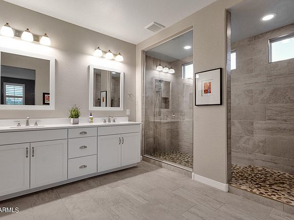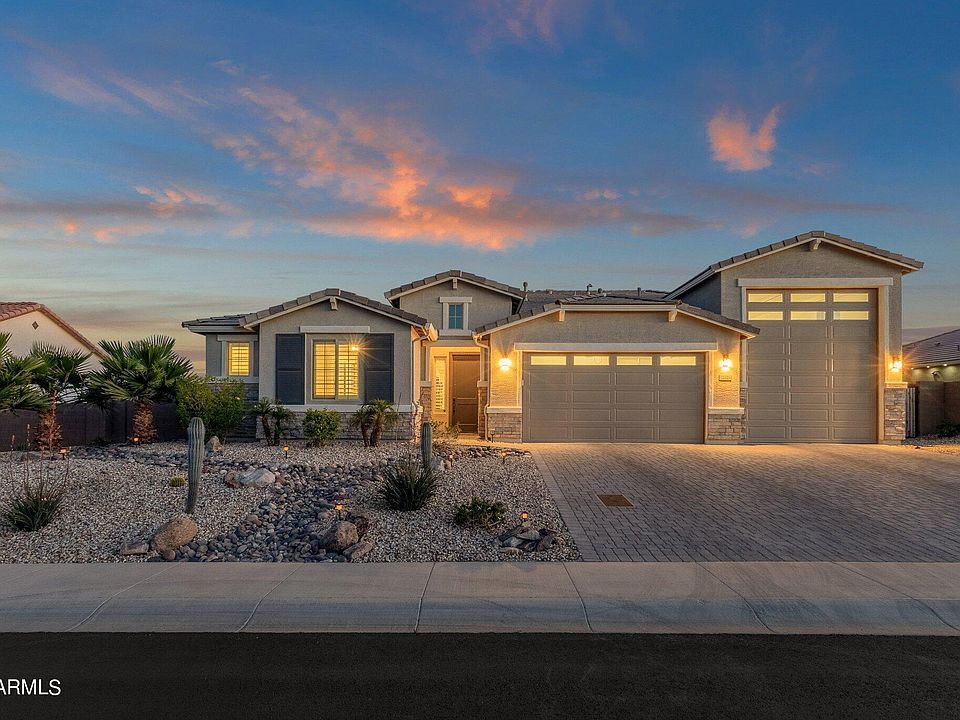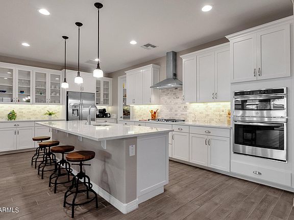 **Location Location** this property is close to the 303 & Loop 101, Cardinal Stadium and shopping. This home redefines energy efficiency and luxury, boasting fully paid new solar panels for minimal utility costs, an air-conditioned full-sized RV garage, and awe-inspiring mountain vistas. Set on a generous 12,000+ Square foot lot within the exclusive Falcon View gated community, its elegance is unmistakable from the first glance. Upon entry, the expansive open floor plan unfolds beneath 9 foot high ceilings, bathed in an abundance of natural light and adorned with top-notch modern finishes. The kitchen, a dream for any gourmet chef, showcasing white shaker cabinets, quartz countertops, Calcutta marble backsplashes, a substantial island under pendant lights, and a dual-zone wine fridge capable of holding 170 bottles.