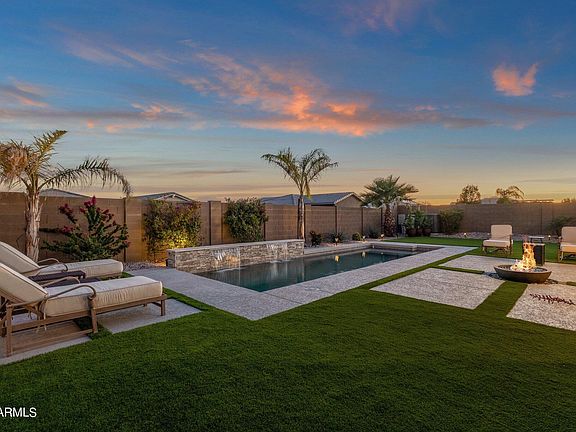 The living area is enhanced by a new 85'' TV (included in sale) and a spacious, well-defined den/office. The master bedroom is oversized and features a barn door that reveals a master bath with a oversized walk-in shower, dual-sink vanity, and dual large walk-in closets. Two additional large bedrooms, each with walk-in closets, share a Jack and Jill bathroom. The backyard is an idyllic retreat with a large inground saltwater pool controlled via WiFi, heated by a new, efficient electric heat pump that also cools the water in the summer, surrounded by an expertly landscaped yard with artificial turf, an expansive outdoor kitchen and living area, covered patio, fire pit, modern pergola, and a secluded above ground spa. The garage accommodates 3 cars plus an RV, measuring 14 feet by 43 feet, ready for an EV charger installation and complemented by a 10 foot RV gate. This home can be purchased turn key as most furniture is available.