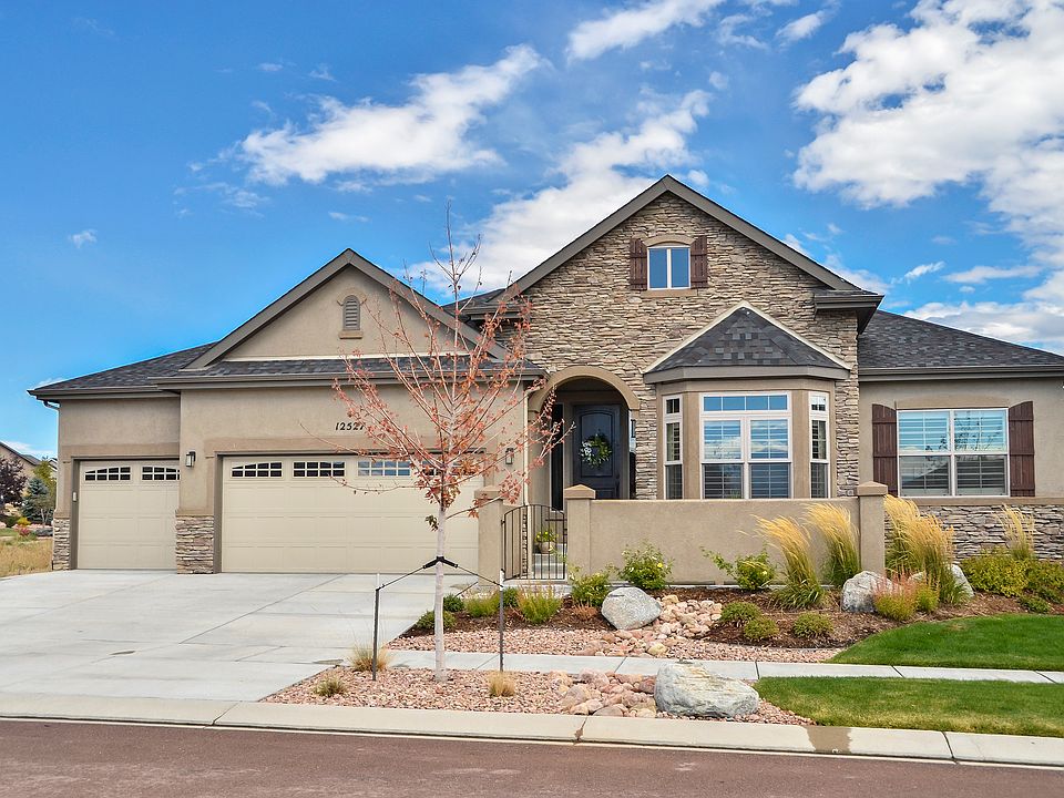 Beautiful ranch style home in Flying Horse community loaded with upgrades. Inviting front courtyard accentuates the curb appeal for this gorgeous home. Inside, you will find a spacious great room, open kitchen with pantry and immense central island. The kitchen is fully equipped with stainless steel professional appliances, including dual ovens, 48" hood, wall oven, and convection microwave. The tech station, dining area, guest bedroom, office and laundry make for ideal main level living. The master suite offers a large walk-in closet and a private bath. The master bath features a stunning tub, over sized shower with rain head, dual vanities and beautiful tile. Downstairs features a family room with wet bar, a flex room that will make a great theater or exercise room and two generous bedrooms.