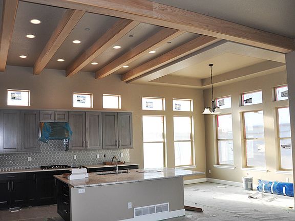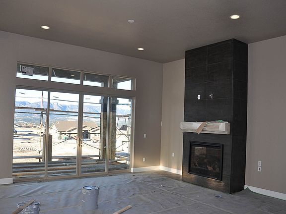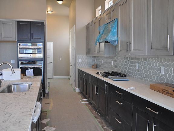 Ready January. Infinity Ranch Plan with 3-Car Garage located in Flying Horse: Master Suite includes gas fireplace, barn door at walk-in closet, barn door between bedroom and bath, tile flooring, stand-alone soaking tub, separate shower with poured mudset pan seat, and dual sinks. Kitchen includes wood beam detail, breakfast bar island, walk-in pantry and stainless steel appliances included smooth-top electric cook-top, built-in wall oven microwave, and dishwasher. Gas fireplace in Great Room. Tile flooring in all baths and Laundry. Tile accent included in Master Bath