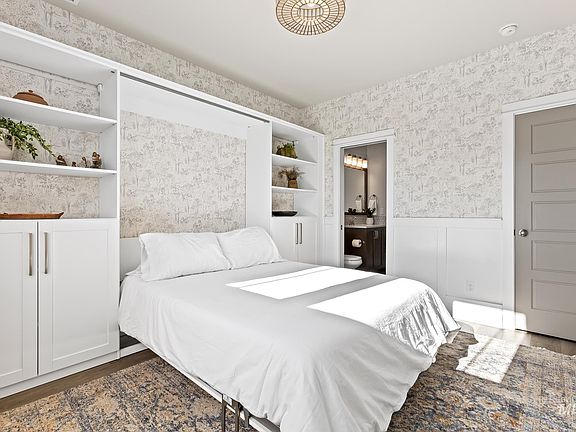 Welcome to this beautifully upgraded home in Crosswinds. Experience the elegance of LVP flooring, big windows, custom curtains, and wainscoting. Relax by the modern farmhouse-style gas fireplace adorned with whitewashed stone. The kitchen's glazed tiles with rustic textures complement the white cabinets with crown molding. Keep your quartz countertops clutter-free with a spacious butler's pantry, complete with a sink and mini-fridge. The upper level has 4 bedrooms, a laundry room and an office loft overlooking the foyer. The primary bedroom offers a coffered ceiling, mountain views, and an ensuite with dual vanities, soaker tub, and large walk-in shower. The 5th bedroom (on main) with shared bathroom has been transformed with wallpaper and a custom Murphy bed by California Closets. An insulated tandem garage with ceiling-mounted storage provides ample space. Enjoy every season on the covered patio extended with brick pavers. This spacious home with designer touches perfectly blends style and functionality.