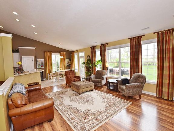 Incredible ranch home in Fishers with soaring ceiling heights, dramatic open floor plan with walls of windows and many upgrades! Former model home includes larger premium lot, 3 car courtyard garage, irrigation, security, niches, built-in desk, 3 bedrooms plus office. Updated laminate wood floors in great room and dining room. Ceramic tile in entry, kitchen, breakfast & laundry. Kitchen has solid surface counters, tiled back splash, center island, upgraded cabinets & appliances stay. HSE Schools