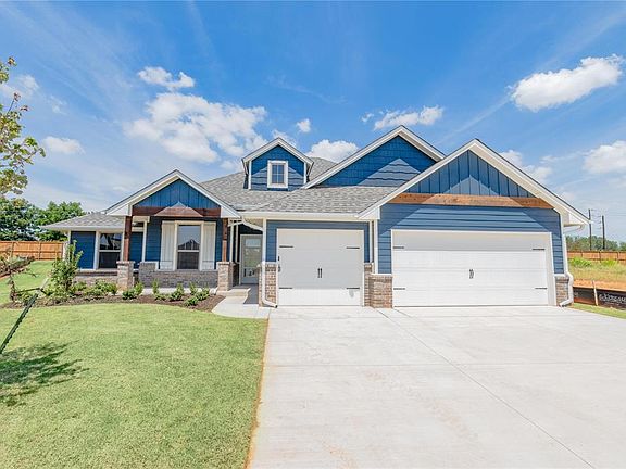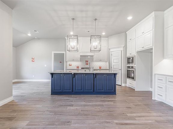 The Hazel floorplan has a total of 2,095 Sqft for living space, including 1,900 Sqft of indoor living and 220 Sqft of outdoor living that features a wood-burning fireplace, a gas line, and a TV hookup! This immaculate home offers 4 bedrooms, 2 full bathrooms, covered patios, a utility room, and a 3-car garage with an in-ground storm shelter installed. The great room presents a beautiful coffered ceiling with a ceiling fan, a gorgeous corner gas fireplace with our stacked stone detail, large 7' windows, rocker switches throughout, and elegant wood-look tile. The high-end kitchen has stainless-steel appliances, including a 5-burner cooktop, decorative tile backsplash, custom-built cabinets to the ceiling with under cabinet lighting and cabinet hardware installed throughout, a large corner pantry, 3 CM countertops, more wood look tile, stunning pendant lighting, and an oversized center island that holds a farm sink, a dishwasher, and a trash can pullout. The primary suite spotlights a sloped ceiling detail with a ceiling fan, windows, and our cozy carpet finish. The spa-like prime bath has a free-standing tub, a dual sink vanity with framed mirrors, 3 CM countertops, a European walk-in shower, a private water closet, and a huge walk-in closet with horizontal and vertical storage opportunities. Secondary bedrooms feature high ceilings with ceiling fans, sizeable closets, windows, and carpeted flooring. Other amenities for this energy efficient home include a tankless water heater, a fresh air ventilation system, R-44 and R-15 insulation, and so much MORE!