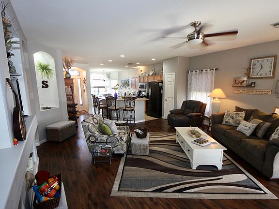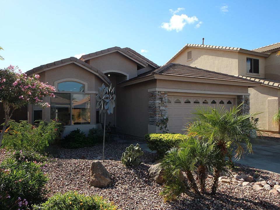 Beautiful single level 3 bed, 2 bath home with 1524 sq ft. This move in ready home shows like a model, located in the highly desired community of Wigwam Creek. Open floor plan with great room, vaulted ceilings & newly updated laminate flooring. Kitchen features a gas cooktop, maple cabinets, new stainless steel appliances, eat-in kitchen area with bay window, large island & bar area & pantry. Spacious master bedroom with walk in closet & double sinks. Outdoor paradise with beautiful fenced play pool, gazebo, covered patio with N/S exposure. Garage includes lots of built in cabinets for plenty of storage. Great location, close community parks, greenbelts & walkways, schools, shopping & freeway. Just 15 minutes from Westgate Entertainment District. This one will not last long.