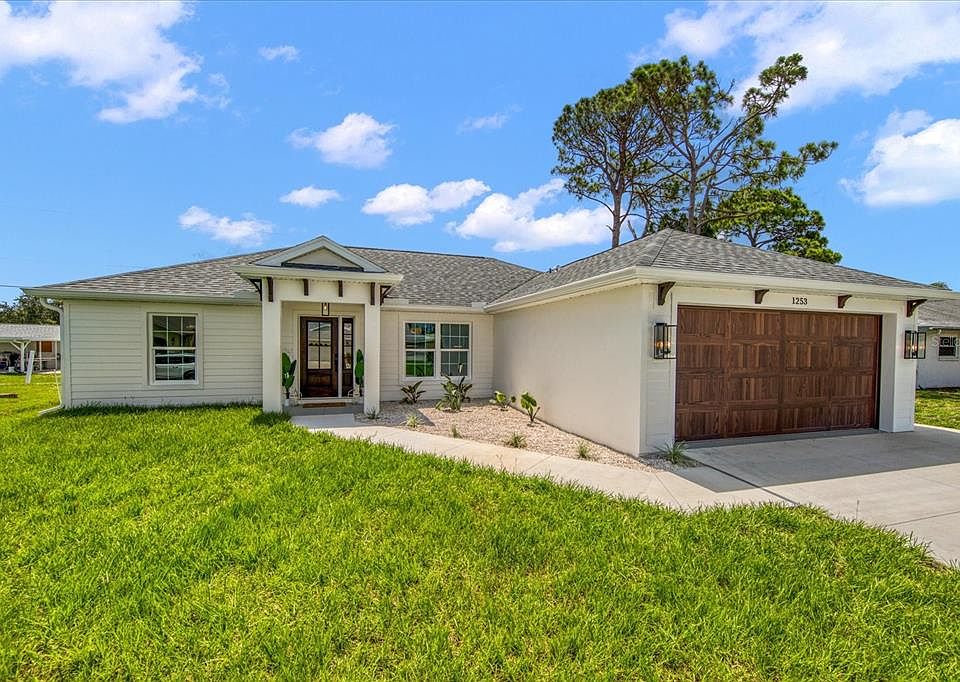 Welcome to one of Blue Water Custom Homes’ latest masterpieces—a stunning blend of modern coastal elegance and timeless charm. This 3-bedroom, 2-bathroom home, complete with a 2-car garage, offers an inviting sanctuary for those who crave both luxury and comfort. The home's curb appeal is undeniable. The striking dark oak stamped carriage house garage door is beautifully complemented by elegant bronze corbels, further accentuated by the wood-grain front door. The pristine white exterior is clad in durable Hardie board lap siding, creating a clean, crisp aesthetic. The charcoal gray roof adds a sophisticated touch, while simple yet beautiful black sconces and a pendant light illuminate the front, rounding off the home’s modern coastal vibe. Step inside to an open and split floor plan that exudes spaciousness, amplified by a cathedral ceiling in the great room. The kitchen features high-end appliances and a stunning white farmhouse sink. Soft gold pendant lights add an elegant touch above the island, while a matching chandelier graces the dining area. Shaker white cabinets harmonize beautifully with the zellige tiled backsplash and white oak floating shelves. Soft gold cabinet pulls add a finishing touch to this sophisticated space. Luxury vinyl flooring with light wood tones runs throughout the main living areas, offering both durability and style. The primary bedroom is a serene retreat, highlighted by a tray ceiling that adds further height to the space. A barn door leads you into the en-suite bathroom, where a Bahamian style teak vanity with a sleek white quartz countertop awaits. Above the vanity, two black-framed mirrors are flanked by three hanging soft gold pendants. The primary shower is a true standout, featuring a light coastal blue herringbone pattern and soft grey hexagon shower flooring. The guest bathroom continues the aesthetic with its matching vanity and light coastal blue stacked tile. A black-framed arch mirror adds a touch of elegance, adorned with two soft gold sconces. Grey tile flooring complements both bathroom's soothing appearance, creating a cohesive and tranquil space. This home is a perfect blend of modern coastal design and sophisticated elegance, offering a luxurious and comfortable living experience. From the stunning exterior details to the thoughtfully designed interior spaces, every element has been carefully curated to create a home that is both beautiful and functional. Situated in a prime location, the residence offers not just a home but a lifestyle. This home is located in South Venice with NO mandatory HOA or CDD fees and is NOT in a hazardous flood zone. By joining the South Venice Civic Association, you'll have the unique opportunity to take the ferry over to the private South Venice Beach and enjoy the benefits of the boat ramp. It doesn't stop there - nearby Venice Gardens offers an Olympic-sized swimming pool with membership open to South Venice residents. The location also offers easy access to Shamrock Park and the Venetian Way bike trail, as well as plenty of shopping and dining options. For your peace of mind, we partner with a nation-wide company, 2-10 Home Buyers Warranty, to offer you a one-year builder workmanship and distribution warranty, as well as a 10-year structural warranty. At Blue Water Custom Homes, we don’t just build houses; we craft homes. Our commitment to quality, customer satisfaction, and attention to detail sets us apart. Please contact our team to arrange a viewing.