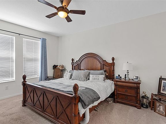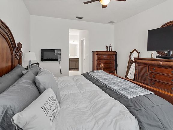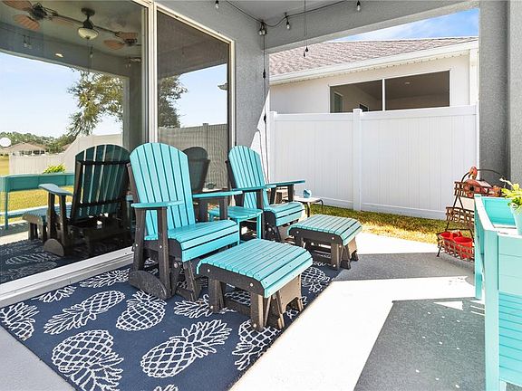 This home boast a large 3 bedroom 2 bathroom split floor plan design. The 1509 square feet feels larger in person with its 9'4 ceilings. The layout is an open concept kitchen that features 42 inch cabinets, stainless steel appliances, quartz cabinets and bar stool seating. Tile flooring is throughout the main living area and comfort carpet tin the bedrooms. The spacious master bedroom highlights his and her closets, double vanity sinks and an over sized walk-in shower. Load with options, this home is a must see. The home is located in the beautiful subdivision Villages of Avalon. This community includes a club house, fitness center and lap pool. It has a low HOA and No CDD. it's conveniently located near the Suncoat Expressway for easy commute, grocery stores, shopping, hiking trail, Week Wachi and much more. Come see what everyone is talking about in the Villages of Avalon.