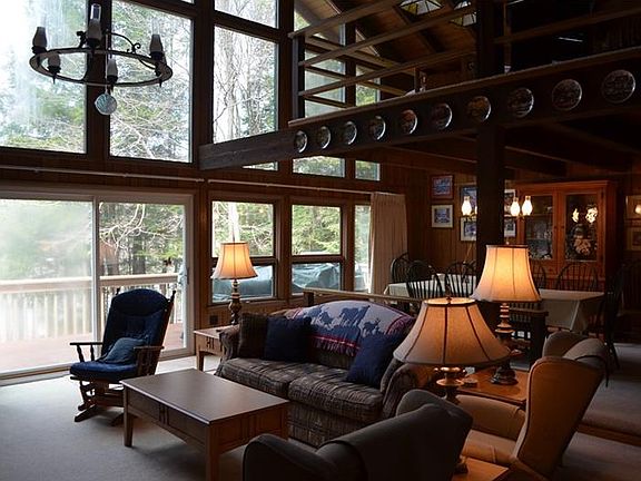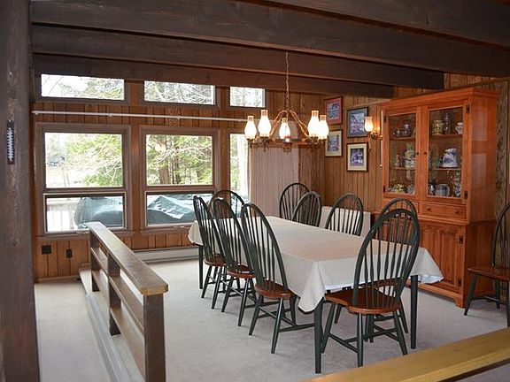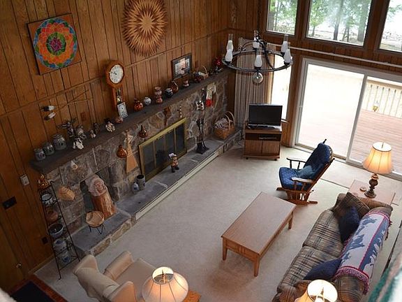 A turnkey waterfront property to fit all your needs--this one has it all! The spacious home sits on one waterfront lot and includes an adjacent second waterfront lot--both lots have dbl. boat docks! Living space galore is in this home featuring an open floor plan with stone fireplace in the great room and a wall of glass for the wonderful lake views. The cathedral ceiling of tongue and groove pine adds to the open and spacious feeling. The dining area, kitchen, bedroom and full bath complete this main floor. A couple of steps down lead to the card room with sliders to a side deck, a storage room with shelving and an upper loft that can be used for extra sleeping space. The main spacious loft with wonderful lake views is a great gathering place with lots of storage areas; two guest bedrooms and full bath complete this upper level. Built in dressers grace all of the bedrooms with cedar lined closets.