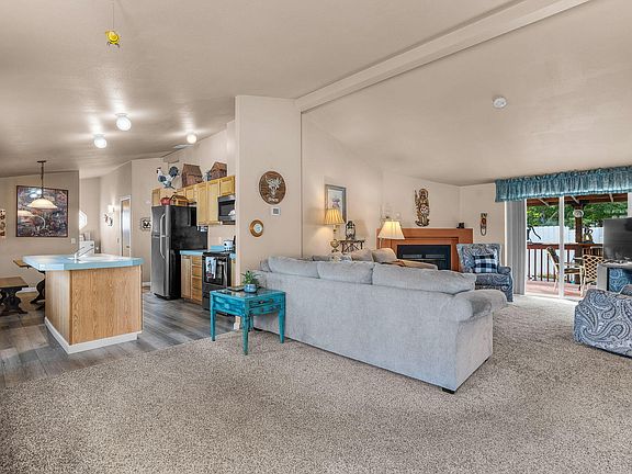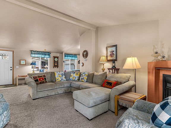 Located in Aspen Creek! This 1999 manufactured home features 3 bedrooms & 2 full bathrooms on a .12-acre lot, with 1,401 sq ft of living space. Upon entering, you'll find an open floor plan highlighted by a spacious kitchen with an island, stainless steel appliances, a new dishwasher 2024, and a pantry. The kitchen & utility room boast new laminate flooring. Included in the sale are the washer, dryer, refrigerator, & freezer located in the garage, along with extra laminate flooring. The HVAC system was updated in 2017 for your comfort. The property offers both a covered front & back patio, a nice driveway, & an additional parking space behind the oversized finished garage. Don't wait—call your agent today to schedule a viewing!