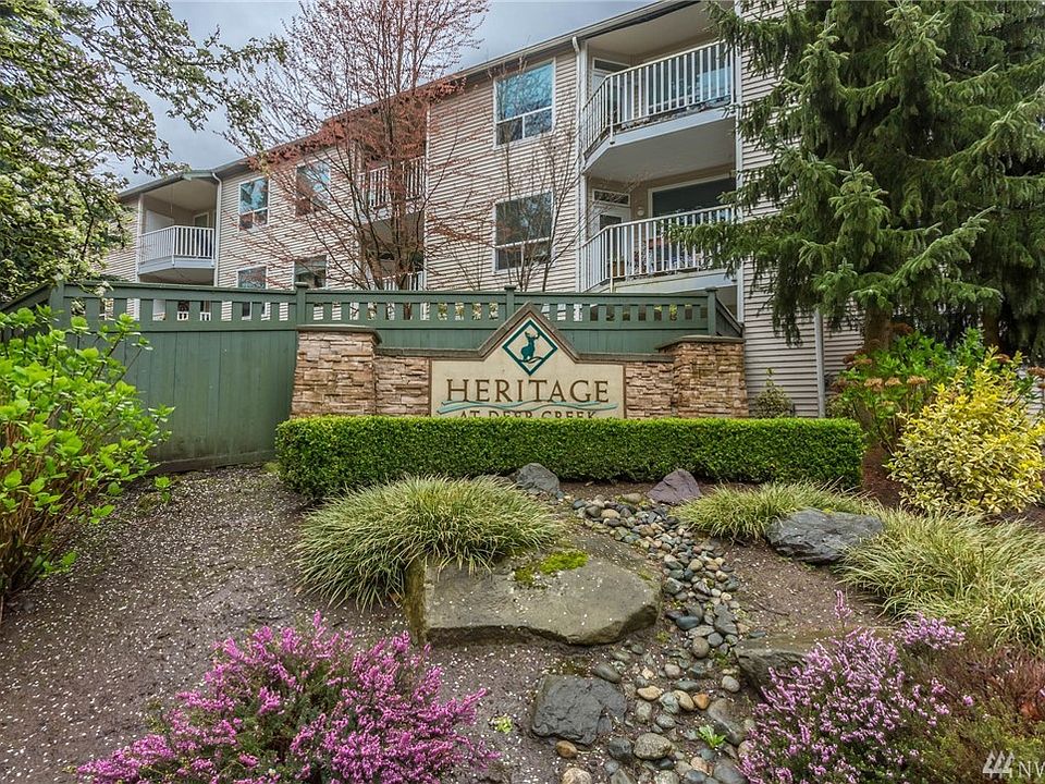 All Quiet at Heritage on Deer Creek! Light-filled 2BR 2BA top floor condo tucked away amongst the trees. Minutes to Paine Field, Boeing, shops, and freeway. Gated entry, well-maintained buildings. Kitchen features full appliance package plus a breakfast bar. Open family room with a balcony, cozy gas fireplace, and loads of windows. Balcony off master, plus ensuite 3/4 bath. Guest room with adjoining bath, big utility laundry room, tiled entry.