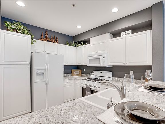 A beautifully maintained 2 bedroom condo in the gated community of Heritage at Deer Creek. The kitchen has lots of cabinet space and an open floor plan that overlooks into the spacious dining and living area with high ceilings and a gas fireplace. The main bedroom features an ensuite with a walk-in closet and access to a private deck with storage. The 2nd bedroom is adjacent to the guest bathroom which has access to the utility room. Additional amenities include fresh paint, updated baths, slate entry, gas range, vinyl plank floors/carpet, wired for surround sound, nest doorbell, keypad entry and ample storage throughout! Its perfectly located right by I-5, Boeing and shopping. **Seller to Pay Special Assessment at Closing** *Strong HOA*