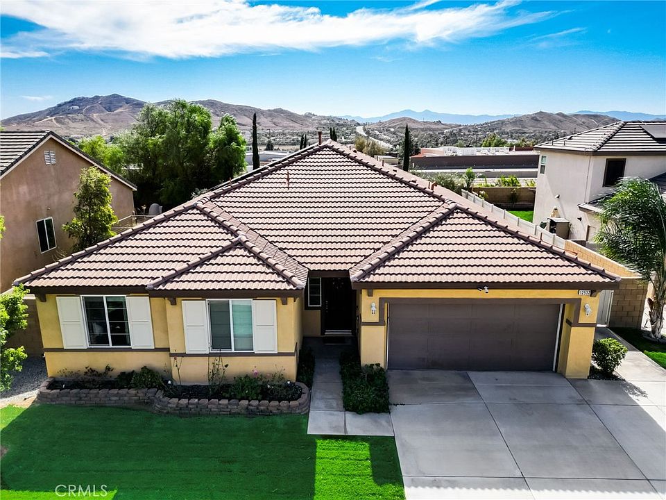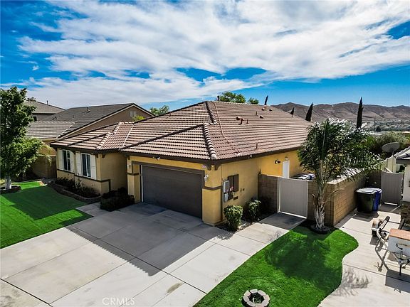 This charming home perched on a hillside in Jurupa Valley is truly a gem. Once the model home it has been lovingly maintained. The single-story layout boasts plenty of top of the line builder upgrades. Stepping inside, notice the laminate flooring, custom paint, and the elegant wainscoting throughout the interior. The heart of the home is the spacious great room, which seamlessly flows into the kitchen, dining area, and living space. What's more, the lighting system is smartly equipped for Wi-Fi, allowing you to control it effortlessly using Alexa. This model home offers three generously sized bedrooms, with an additional room currently serving as a den. The owner's suite, conveniently situated just off the living room, is filled with natural light and includes a generously sized walk-in closet, a luxurious sunken tub, and double sinks. The backyard is a delightful oasis with a variety of fruit trees, a vegetable and spice garden, and two recently installed Aluma wood patios. You can relax and unwind in the spa or use the space to gather with friends and family. The three-car tandem garage is not only practical but also equipped with a tankless water heater and an EV charging outlet. An extra-wide driveway that provides RV parking and offers electric hookups. The solar panels on the home are leased and are part of the Net Energy Metering program, which can be transferred to the new owner. This area of Jurupa Valley is undergoing exciting development with numerous new retail stores, restaurants, and amenities. It's a prime time to make this your new home. Super convenient access to schools and major freeways, including the 60, 10, 215, and 15.