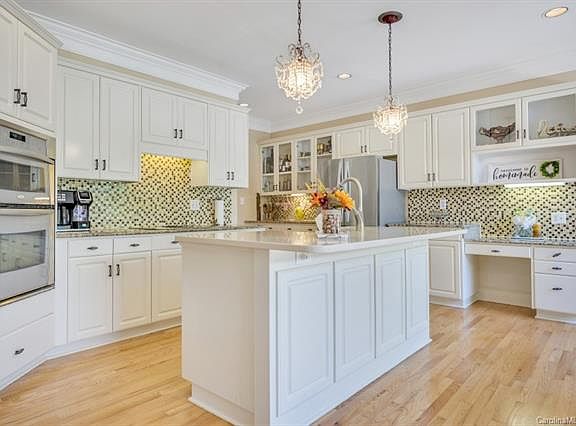 shows like a model home. PRE INSPECTED PROPERTY. Fabulously renovated, Open floorplan creates a perfect environment for entertaining & casual daily living. Gourmet Kitchen has all the bells & whistles. large Bonus Rm/5th bedroom with walk in closet. Dual staircases. replaced windows, first floor furnace, roof and water heater. wood flooring in entire house. Kitchen w/quartz and granite counter tops, large island, ss appliances & beautiful breakfast area. Over size deck, fire-pit, gorgeous inground pool, Flat private large backyard over 3/4 of an acre with 5 ft fenced around, breath taking landescaping with fruit trees.. extra security screening for entire backyard fence . All custom curtains and crystal chandeliers stay. Exterior (stucco and windows ) have been inspected and caulked professionally using 795 Silicone building sealant.(2020) All exteriors windows has been replaced by Lowe's special order. Owner is NC licensed Agent
