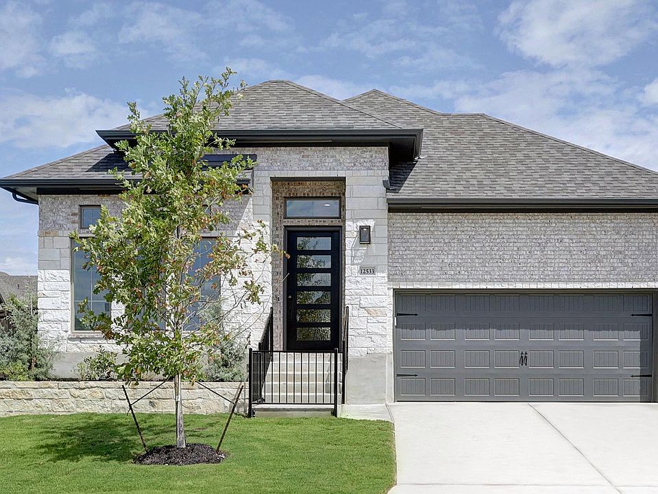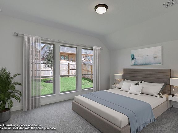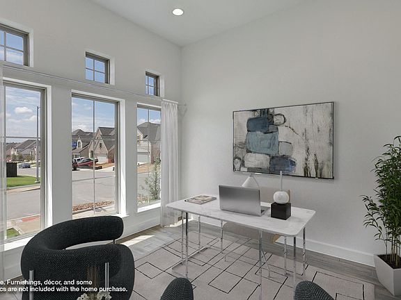 Home office with French doors set at entry with 12-foot ceiling. Extended entry leads to open kitchen, dining area and family room. Kitchen features corner walk-in pantry, generous counter space and island with built-in seating space. Dining area flows into family room with wall of windows. Primary suite includes double-door entry to primary bath with dual vanities, garden tub, separate glass-enclosed shower and two large walk-in closets. A guest suite with private bath adds to this spacious one-story home. Covered backyard patio and 6-zone sprinkler system. Mud room off two-car garage.