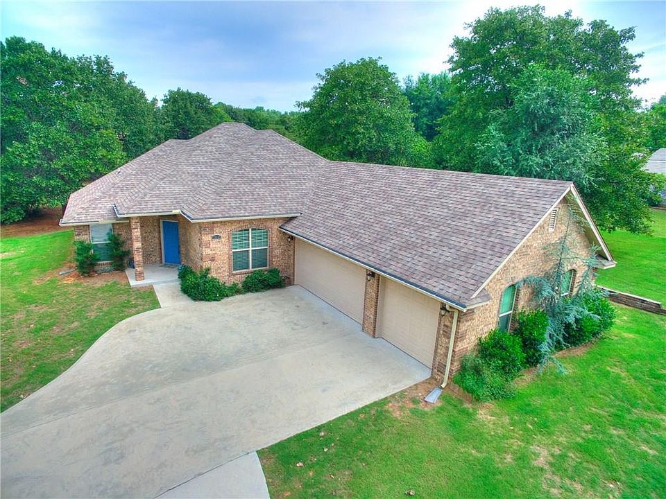 **Seller just replaced all carpet flooring**Beautiful 4 bedroom/2 bath/3 car garage home on almost 2 acres! In close proximity to Tinker AFB, Shopping, and highways. Located in Carl Albert school district. This property is quiet and serene! This almost new customs built home has plenty of space for a large family. The living room is big enough for a sectional and furniture is easy to arrange. Kitchen is spacious with a breakfast bar, granite countertops, custom cabinetry, stainless steel appliances, dining area, and large pantry. Master bedroom suite includes bathroom with walk-in shower, tub, and two sinks. Backyard includes a covered patio and an area that is fenced w/ chain link fencing for dogs. Gazebo is included in the front yard. 3D Property tour available. Appraisal report was completed just before listing with a value of 262,000.