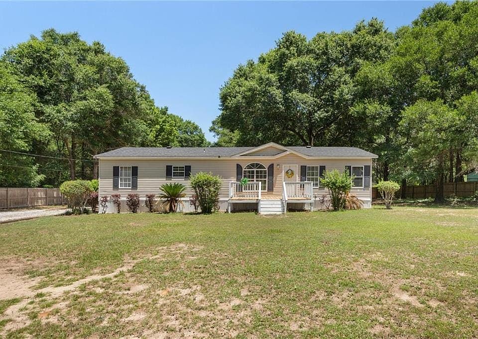 Welcome to peaceful country living with city convenience! This well-kept and updated 3-bedroom, 2-bath double-wide mobile home is nestled on nearly 1 private acre in Wilmer Acres. Enjoy the charm of a rural setting while being just minutes from I-158 and Moffett Road (Hwy 98) offering an easy drive to Mississippi, Florida, and all that Mobile County has to offer. With 1,506 square feet of living space, this home features laminate flooring in the main living areas, a bright white kitchen with a center island, black appliances, and a cozy eat-in kitchen. There's a separate dining room for larger gatherings and a dedicated office space complete with a built-in desk, open shelving, and cabinetry for extra storage. Outside, you'll love relaxing on the large rebuilt front deck or hosting gatherings on the covered back deck overlooking your fully fenced private yard, perfect for pets, play, or planting a garden. Move-in ready, affordable, and perfectly positioned for those who want a little land without losing convenience. Schedule your showing today before it's gone! Buyer responsible for verifying all measurements and relevant details. 2025-06-03
