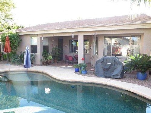 Lovely 3 bedroom home with unique floorplan. Office/library as you enter, then great room living area with eat in kitchen and bar. Split master, secluded, suite with large walk in. Washer/Dryer room has exceptional steel counter. Tandem 3 car garage. sparkling pool, fun backyard decor. Many upgrades to home. Well taken care of. Near middle school, play area. This is a Litchfield Park address with County services.