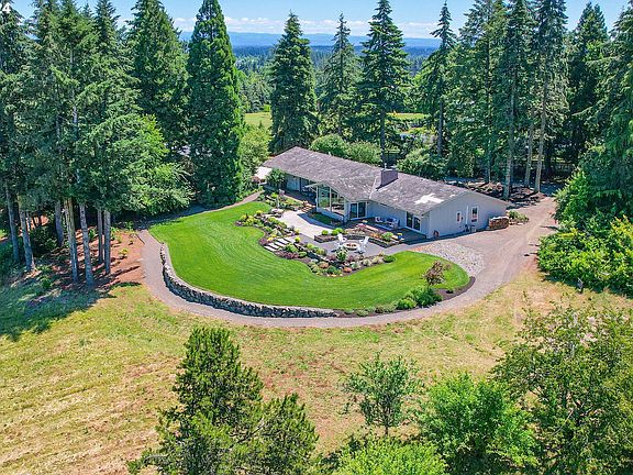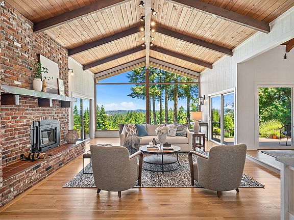 Welcome to your exquisite personal sanctuary, a one-of-a-kind single-story retreat nestled within a gated community in Sherwood on an expansive 3.27-acre parcel, this exceptional residence seamlessly blends midcentury elegance with farmhouse charm. As you step through the grand foyer, the living room welcomes you with its vaulted wood and beam ceilings, a striking brick fireplace, and breathtaking vistas that evoke a profound sense of peace and grandeur. Every detail has been meticulously renovated, including new hardwood flooring, windows, an HVAC system, electrical, plumbing, and more. Sunlight pours through expansive windows, while numerous sliding doors open to TREX decks and custom-poured patio spaces, perfect for alfresco entertaining or serene relaxation. At the heart of this home lies a gourmet kitchen, equipped with JennAir appliances, dual quartz kitchen islands, and a wine fridge. This culinary haven is ideal for preparing exquisite meals to be savored in the adjoining dining room. The family room is a welcoming space, perfect for intimate gatherings, enhanced by vaulted wood ceilings and custom built-ins. The primary suite is a luxurious retreat, featuring a lavish bath with a large frameless tiled shower, exposed brick accents, and a walk-in sauna. Each of the three bedrooms boasts vaulted ceilings, offering a sense of spaciousness. With 3 bedrooms and 2.5 bathrooms spread over 2,842 square feet, this home offers ample space for beautiful living and ultimate comfort. This unique hideaway is a retreat where you can live your best life, surrounded by boundless beauty. Mesmerizing views of Mt. St. Helens and Mt. Adams in the distance further enhance the serene and picturesque setting. Additional highlights include a three-car garage with an extra-tall bay, a separate 24x36 shop, and a circular driveway with abundant parking. A home and sanctuary that promises to lift your spirit and capture your heart at first sight.
