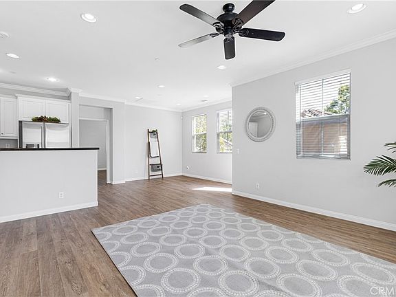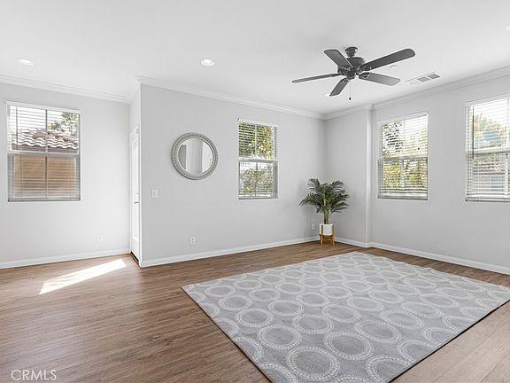This beautiful Eastvale condo has been lovingly cared for by the owners and is now ready for you. Featuring luxury vinyl flooring throughout, crown molding, ceiling fans and soothing light grey paint on the walls. This condo is an end unit with no one above or below you and it has an abundance of natural light which flows through the ample amount of windows. The first floor showcases the first of two primary bedrooms with an ensuite bathroom. Also on the first floor is a large storage closet under the stairwell as well as the laundry area that houses the washer and dryer, which are included in the sale. Upstairs you will be delighted to find an open floor plan featuring the living room, dining room, half bath, second primary bedroom and stylish kitchen. The kitchen has stainless steel appliances, granite countertops, white cabinetry with coordinating hardware. The upstairs primary bedroom has a walk in closet with custom built ins and the ensuite bathroom that has double sinks with plenty of counter space. There is also a quaint patio off of the living room and dining room which is perfect for sitting and relaxing. You will love the location of this condo! It is adjacent to the pool and clubhouse area as well as the gated front entry of the complex. The attached two car garage is super convenient as well as the numerous parking spaces out front. The complex is located conveniently close to three major shopping centers, numerous restaurants and the 15 freeway.