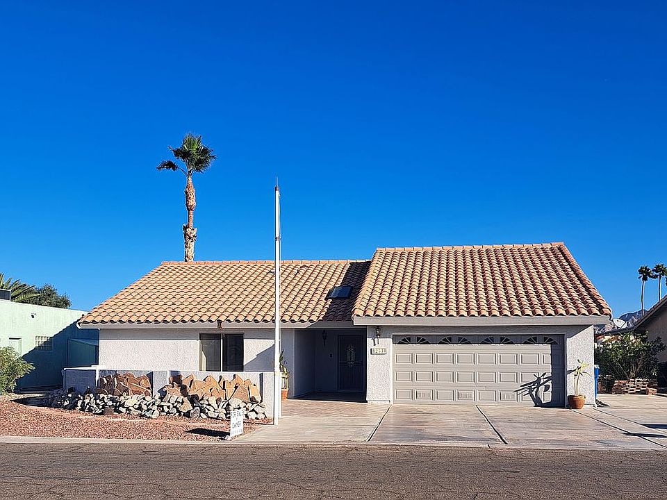 3br/2ba 1495sqft home In back you will be treated to a perfect golf course view lot. 16th tee box, in a no ball hit zone! Big tiled back patio with pergola extension from house. Inside you'll find a great room with vaulted celings. Granite counters in kitchen and both bathrooms. All cabinets, walls and ceiling freshly painted. New carpet in bedrooms and living room 20in tile in all other rooms New water heater Includes washer, dryer, refer, stove and built-in microwave 2 car garage Just had exterior completely painted last week Extremely low maintenance yard
