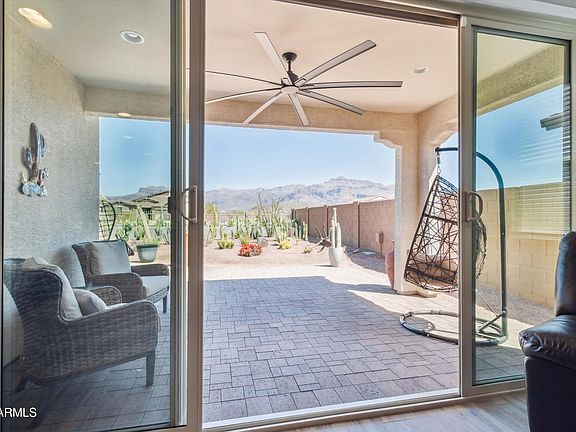 Stunning 1960 square feet, 4 bed, 3 bath single-level home in Gold Canyon's Peralta Canyon community! Fully furnished (see list). Built in 2021 with breathtaking views of the Superstition & Dinosaur Mountains from the backyard, great room, kitchen, and primary suite. Serene backyard with covered patio, extended paver patio, and serene water feature. Kitchen appointed with quartz counters, espresso cabinets, gas cooktop, walk-in pantry. Primary Bedroom offers a large tiled shower with bench & double sinks. Tile throughout the main areas (carpet in bedrooms only) -enough new matching tile for the primary bedroom - stored in the garage. Washer/Dryer/Fridge included. Other added benefits include french drains on sides of home, gutters & epoxied garage floor with built-in cabinets. A BEAUTY