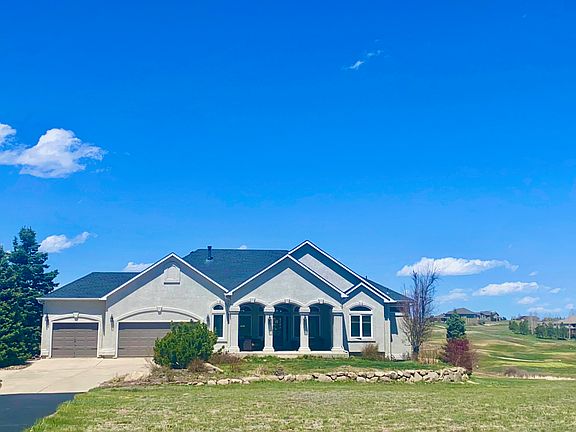 Fantastic Kings Deer Home on 2.5 acres with VIEWS, VIEWS, and more VIEWS! ~ Mountain Views ~ Pikes Peak Views ~ Golf Course Views ~ Home overlooks Hole No. 5 at the picturesque Kings Deer Golf Course ~ Panoramic views from wall-to-wall, main-level windows ~ Tons of natural light ~ Enjoy awesome Colorado sunsets from large, trex deck overlooking the mountain and course ~ New exterior paint 2021 New carpet in 2020 New HVAC 2021~ New roof in 2020 ~ New well pressure tank in 2020 ~ Updated Kitchen, which included installing new: Cabinetry with soft-close drawers/doors, Gas Cooktop, Tile Backsplash, Granite countertops, Refrigerator, Oven ~ Island seating and large Eat-In kitchen ~ Formal Dining off of Great Room ~ Main-level Master Bedroom with walk-out to trex deck ~ Main-level office shared jack and Jill bathroom~ Large basement great for entertaining ~ Rec Room area with Wet Bar and Pool Table in basement ~ Plenty of storage ~ Two 40-gallon hot water heaters ~ walk out to 8 person Hot Tub~ Laundry room with new washer/dryer ~ Snow Blower and riding lawn mower stay with the home for renters use~ Electric dog fence with two collars ~ Extensive sprinkler and drip system ~ Come and see this beautiful home on one of the few lots to have Pikes Peak and golf course views!