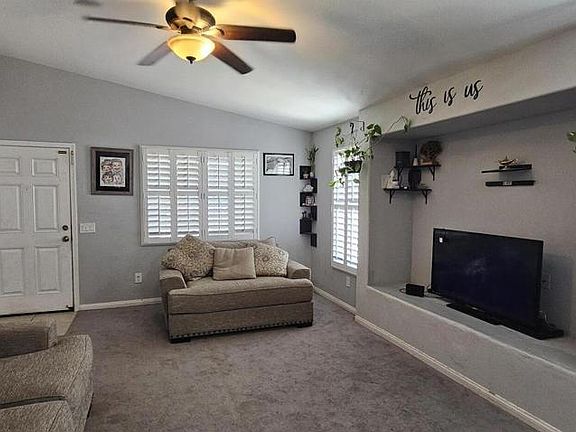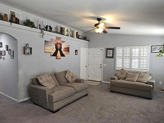 Welcome to your new home in Vista Del Mar! This spacious 4 bedroom, 2 bathroom home is perfect for families or anyone looking for a comfortable and well-maintained place to call home. The black metal screen around the entrance provides privacy and helps to keep the entryway cool, while the custom-made shutters throughout the house that are 4 sections instead of the standard 2. These shutters add a touch of elegance and sophistication to the home. The living room is bright and airy, with a ceiling fan to keep you cool on those hot summer days. The carpet in the common areas is soft and inviting, while the tile floors in the kitchen, bathrooms, and laundry room are easy to clean. The quartz counter tops in the kitchen and bathrooms add a touch of luxury, and the stainless steel appliances make cooking a breeze. The bedrooms are all a good size, and each one has a ceiling fan for added comfort. The laundry room has cabinets for storage, and it leads to the 2-car garage. The backyard is a great size for entertaining guests or just relaxing on a warm summer day. There is plenty of space for a barbecue, a fire pit, or just some lawn chairs to soak up the sun. This home is move-in ready, and it's located in a quiet and convenient neighborhood. You're just minutes from Red Earth Casino, off-roadding and hiking trails, So what are you waiting for to call this your home!!