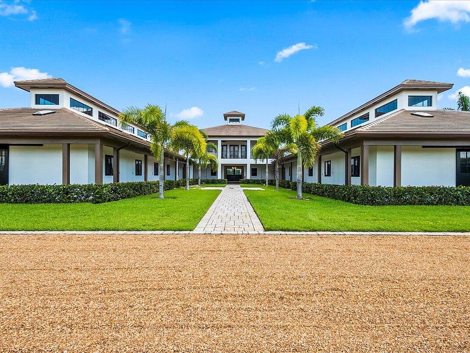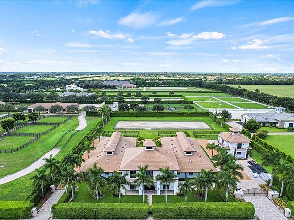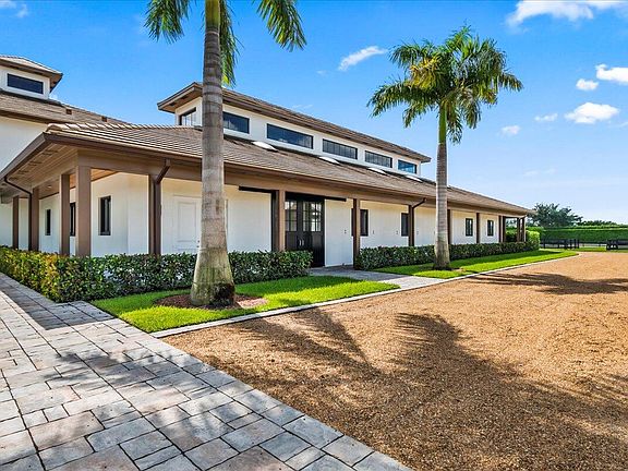 Luxury equestrian lifestyle beckons. This private gated farm is nestled in the the prime location of The Equestrian Club. Every feature of the custom built 18 stall barn reveals spectacular attention to detail. The barn has gorgeous cypress wood beamed ceilings with light filled cupolas and offers 2 aisles, each side mirroring the other. Thoughtfully constructed, both sides of this hurricane impact rated barn include new stall mats, an updated tack room, lounge/office with half bathroom, 2 wash stalls, 2 grooming stalls, a feed room, and a laundry room. Your horses will adore the brand new HSPG outdoor arena currently underway and 3 paddocks. The exquisite 3 bedroom, 3 bathroom owners residence is situated above the barn, is bathed in natural light, Beautifully appointed, the master suite has a huge custom built walk-in closet and a sleek en-suite bathroom with a soaking tub and separate shower. An entertainer's dream, the open kitchen is well-equipped for all of your needs with state-of-the art Thermador Pro appliances, a 6 burner gas stove, wine fridge, a large island with prep sink and tons of storage space. Restore, relax, and enjoy outdoor living with access from each living space on the expansive covered patio with an outdoor kitchen and picturesque views overlooking the arena and paddocks. Other exterior amenities include an outdoor gas fire pit, a separate barn entrance for caretakers, a whole property security system, all surrounded by fully mature lush green landscaping and privacy hedging. Adjacent to the owner's home is an impressive 2 bedroom, 2 bathroom staff apartment that sits above an oversized 2 car garage with plenty of storage. The modern and bright apartment includes a full kitchen, laundry room, and balcony with equally enchanting views of the grounds. With an abundance of resort style community amenities, close proximity to WEF, dining and shops, you'll never want to leave this alluring equestrian oasis!
