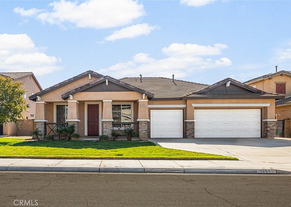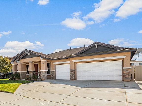 EXPANSIVE 2,299 SQ. FT. SINGLE STORY POOL HOME ON A OVERSIZED 7,405 SQ. FT. LOT WITH A 3 CAR GARAGE! This home is located in a very desirable neighborhood that reflects pride of ownership with no HOA dues and reasonable taxes! Upon entry, you are greeted by tall ceilings, recessed lighting and porcelain tile/wood grain flooring that are consistent throughout all main living areas. Your 4th bedroom, currently being utilized as an office, is secluded from the other bedrooms to maximize privacy. The open concept kitchen flows seamlessly to the massive family room with a gas fireplace and stunning rear yard through sliding glass doors. Your kitchen features wood cabinetry, stainless steel appliances, pantry and a center island with bar-top seating. A half bathroom off of the entertaining areas is perfect for accommodating guests. The primary bedroom suite is gigantic, showcasing an ensuite sitting area, sliding glass doors to the yard, a walk-in closet and primary bathroom with a soaking tub and separate glass enclosed shower. Two additional guest bedrooms near the primary are generously sized and share a second full bathroom. A full inside laundry room is located off of the hall. Your stunning and private rear yard has a large concrete patio with a well constructed patio cover to shelter you from the sun and keep the house cool. The inground pool and spa are perfectly situated for sunlight all day due to the east to west direction. A large grass area flanks the pool. Additional features include: A true 3 car garage, large driveway, tile roof and dual pane windows throughout.