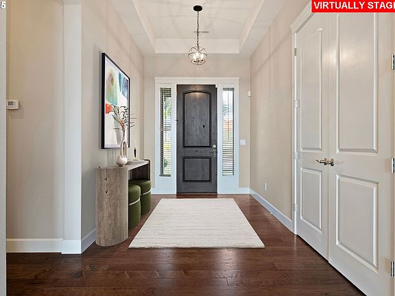 Perched on a hilltop in one of Happy Valley’s most sought-after neighborhoods, this custom-built home offers the rare combination of single-level living and sweeping Mt. Hood and Valley Views. Built by Cascade West—a prominent local builder known for luxury craftsmanship and award-winning Parade of Homes designs—this 2,574-square-foot home features 3 bedrooms plus an office, 2 bathrooms and wows with upgrades like 10-ft ceilings, 8-ft solid core doors and hardwoods throughout. The heart of the home is the vaulted great room featuring a gas fireplace, built-ins, hardwood floors, and of course VIEWS. The chef’s kitchen is equipped with stainless steel appliances, a 5-burner gas cooktop, built-in convection oven and microwave, granite countertops, soft-close cabinetry, and a large 6-seat island perfect for entertaining. A dedicated dining area opens to the covered deck with stairs leading down to the beautifully terraced and landscaped backyard—complete with retaining walls, gardens, and newly installed fencing around the entire property. The primary suite is equally impressive with recessed lighting, walk-in closet with built ins and a luxurious ensuite with a soaking tub, tiled walk-in shower and double sink vanity. Two additional spacious bedrooms plus an office offer flexibility for remote work or guests. Extras include a 3-car garage, tile-floored mudroom with sink and built-in shelving, central A/C, and central vacuum. Set on a private 1/3-acre lot near walking paths and top-rated schools—this is a rare opportunity for single-level living with views.