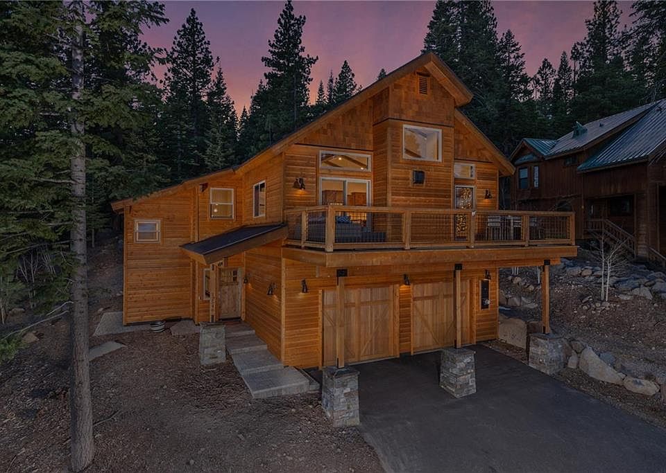 Highly desired Lower Tahoe Donner. Magnificent, Wide, Mountain Views! If you want a Serene, Sunny, Super Private, Quiet Setting, you found it! AC! Front Deck Big Mountain Views and paver patio with gas fire pit. Main Bedroom has its with own private deck backing greenbelt. Private Sled Hill for the kids next to the home! Video & Audio Surveillance with Alarm on Property. Reclaimed, Chestnut flooring throughout, Copenhagen Granite Countertops, Massive stone gas fireplace, custom audio and NEST system with AC, huge great room, outdoor deck, 2 en-suite bedrooms and oversized finished garage with built in cabinets and TV. Great Open layout with high ceilings, Chefs kitchen, large family room, dining area. Large sliders to front deck looking at the massive mountain views. Half bath, Laundry room, 2 en-suite bedrooms. The Main Bedroom has its own private deck to chill and view the greenbelt. Not sold on a price per square foot as typical in our area. 500 Sq Ft Garage.